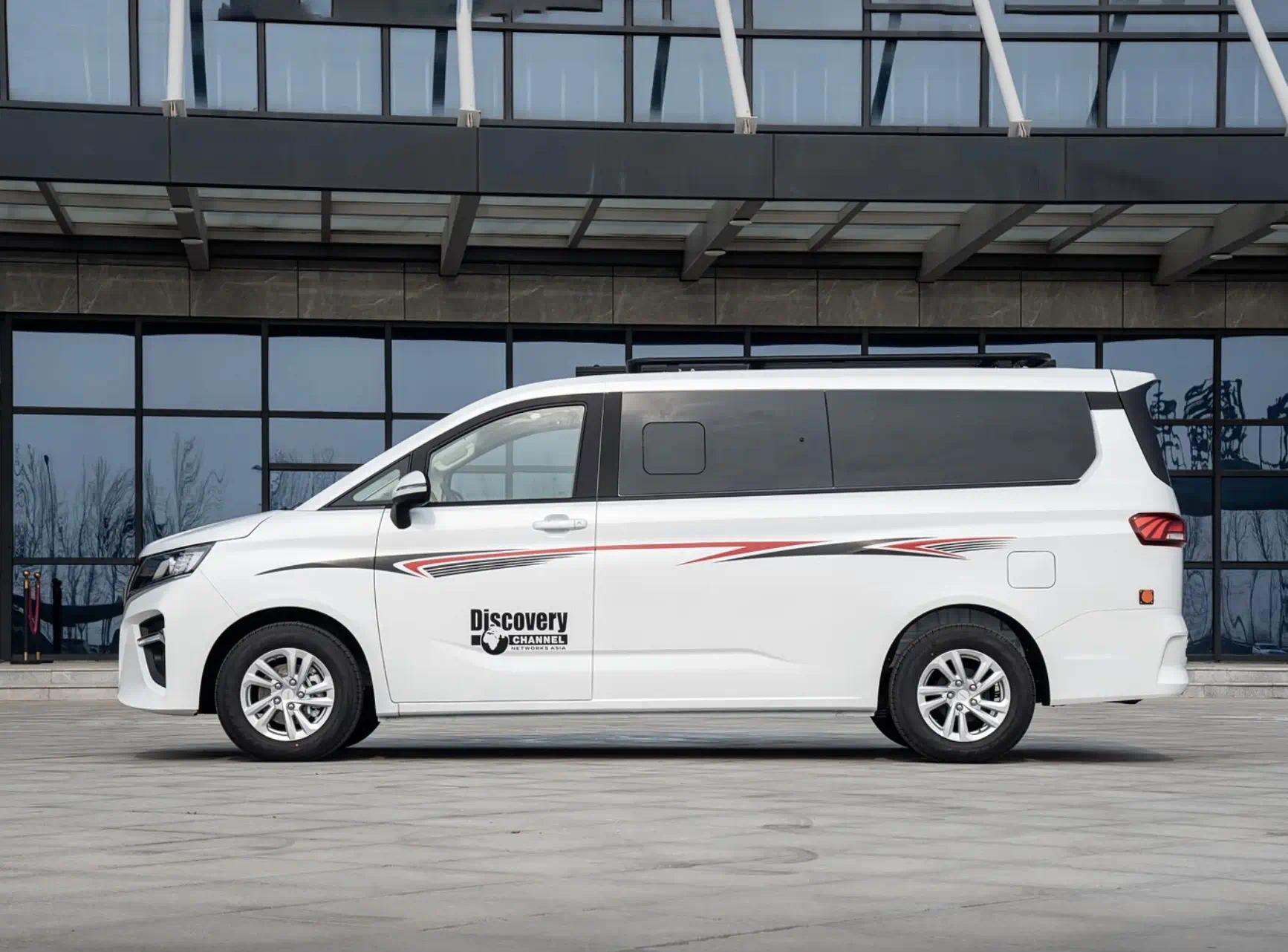车身侧面线条平直规整,采用侧滑门设计,方便乘客上下车,适配家用与营运场景,自动挡车型车身高度适中,可轻松进出城市地库,宿营车因户外定位,车身高度提升至2116mm,配备车顶平台与侧边帐,强化户外使用属性。车尾造型简洁厚重,配备竖直排列的尾灯组,后包围同样配备防擦饰条,兼顾实用性与美观度。两款车型均提供多种基础配色可选,宿营车还可选择专属拉花,进一步凸显个性化。