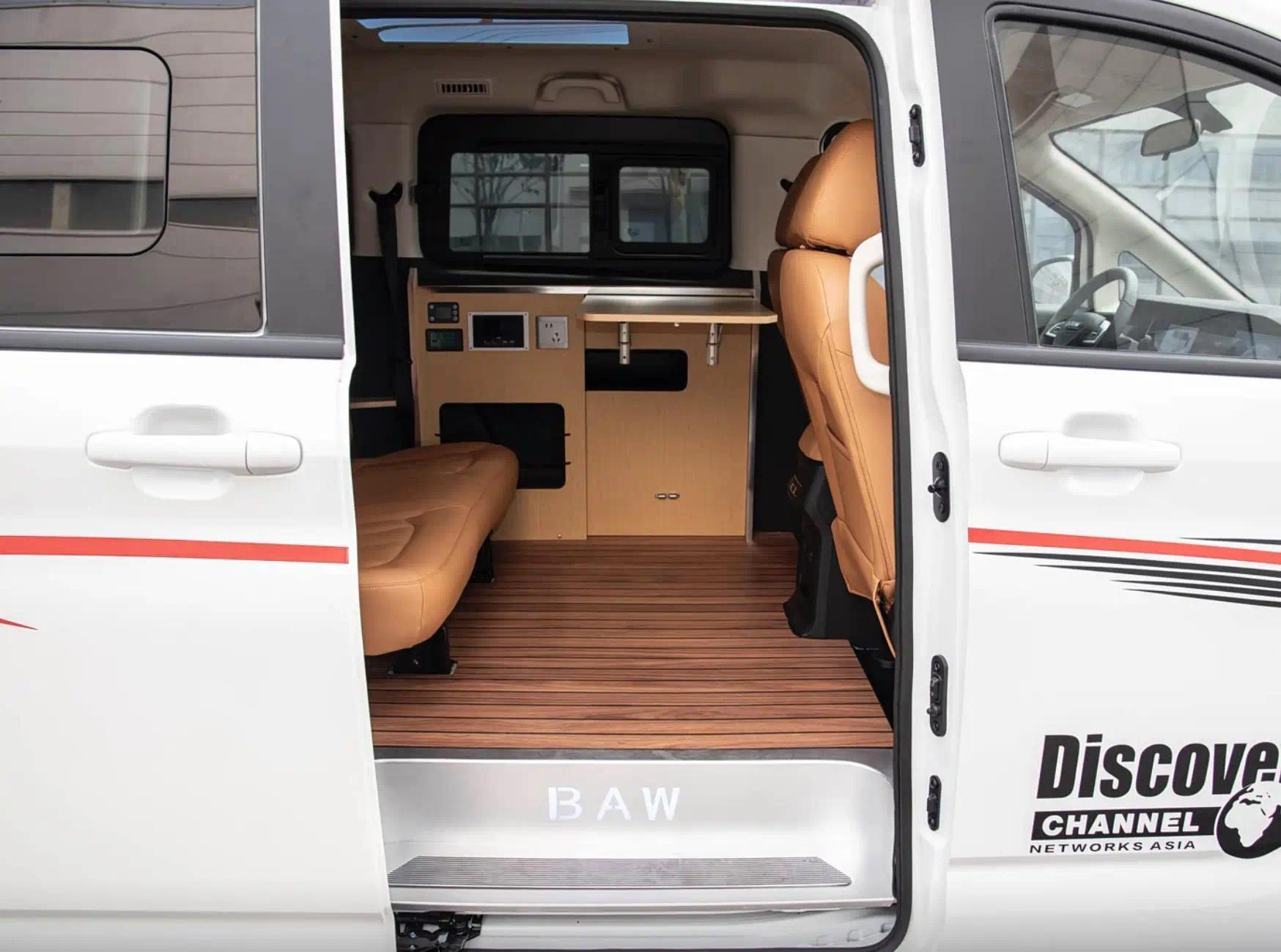 内饰方面,新车以实用为主,兼顾基础舒适性,座舱配备7英寸全液晶仪表与10.25英寸中控屏,支持基础的手机互联与蓝牙通话功能,操作便捷易懂。自动挡车型新增黑灰+茶渍色内饰配色,配备皮质方向盘与仿皮座椅,质感小幅提升;宿营车则侧重户外实用设计,配备房车专用地板、侧吧台等设施,二排座椅放倒后可形成1950mm×1470mm的床铺,搭配海绵床垫,满足户外休息需求。